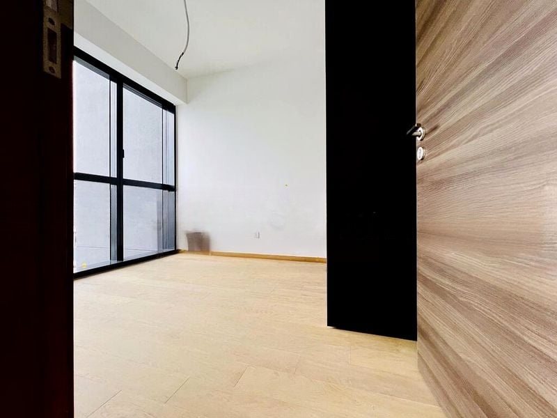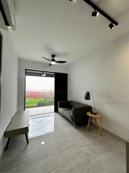 Step into a brand-new sanctuary where modern minimalist design meets comfort. The open-concept living area is bathed in natural light, showcasing polished floor tiles and track lighting that accentuates the spaciousness. Glass sliding doors lead to a charming balcony, offering serene views of lush greenery and open land, creating a peaceful retreat in the heart of Hougang.