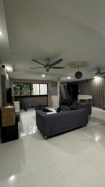 Step into a beautifully renovated HDB flat that exudes modern elegance. The living room welcomes you with its decorative ceiling medallion, large windows that invite natural light, and a stylish TV feature wall, creating an ambiance that is both functional and inviting. The wallpapered accent wall adds a touch of sophistication, making it the perfect space for relaxation and entertainment.