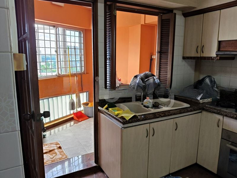 Step into a bright and airy space where the charm of original terrazzo flooring greets you at the entrance, setting a warm and inviting tone. Large windows in the bedroom allow natural light to flood the unit, offering unblocked views of the lush greenery and HDB estate below, creating a serene atmosphere that feels both spacious and connected to nature.