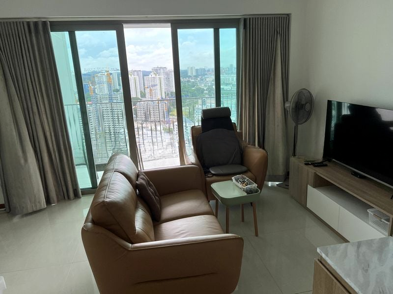 Step into a bright and airy sanctuary where abundant natural light floods through floor-to-ceiling windows, framing stunning unblocked views of the city skyline. The inviting ambiance is enhanced by the elegant finishes, including large format floor tiles and a stylish leather sofa set in the living room, creating a perfect space for relaxation and entertainment.