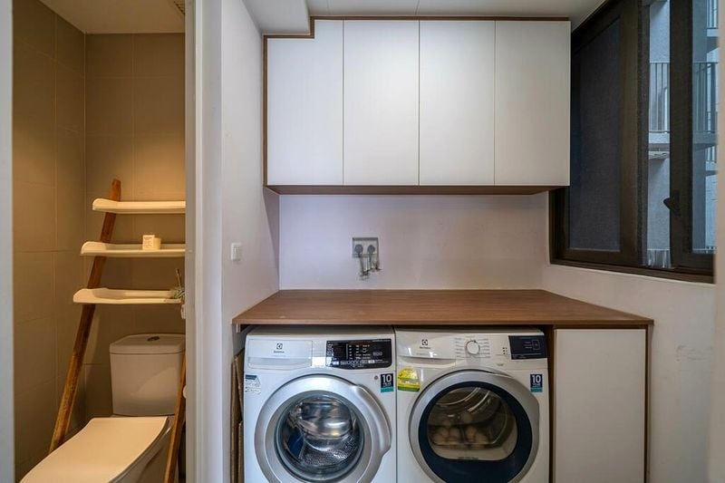 This well-maintained unit features three spacious bedrooms, each adorned with wooden flooring and built-in sliding wardrobes for optimal storage. The master bathroom boasts a walk-in shower with a sleek glass partition, while the dedicated laundry area is equipped with a side-by-side washer and dryer, complete with a wooden countertop and overhead cabinets for added convenience. The thoughtful layout maximizes space and functionality, making everyday living effortless.